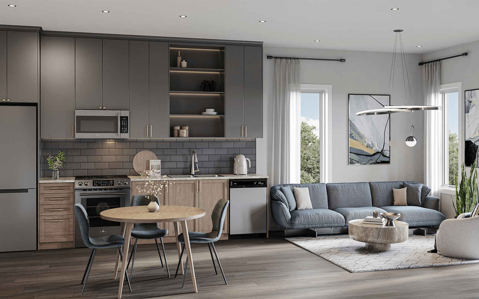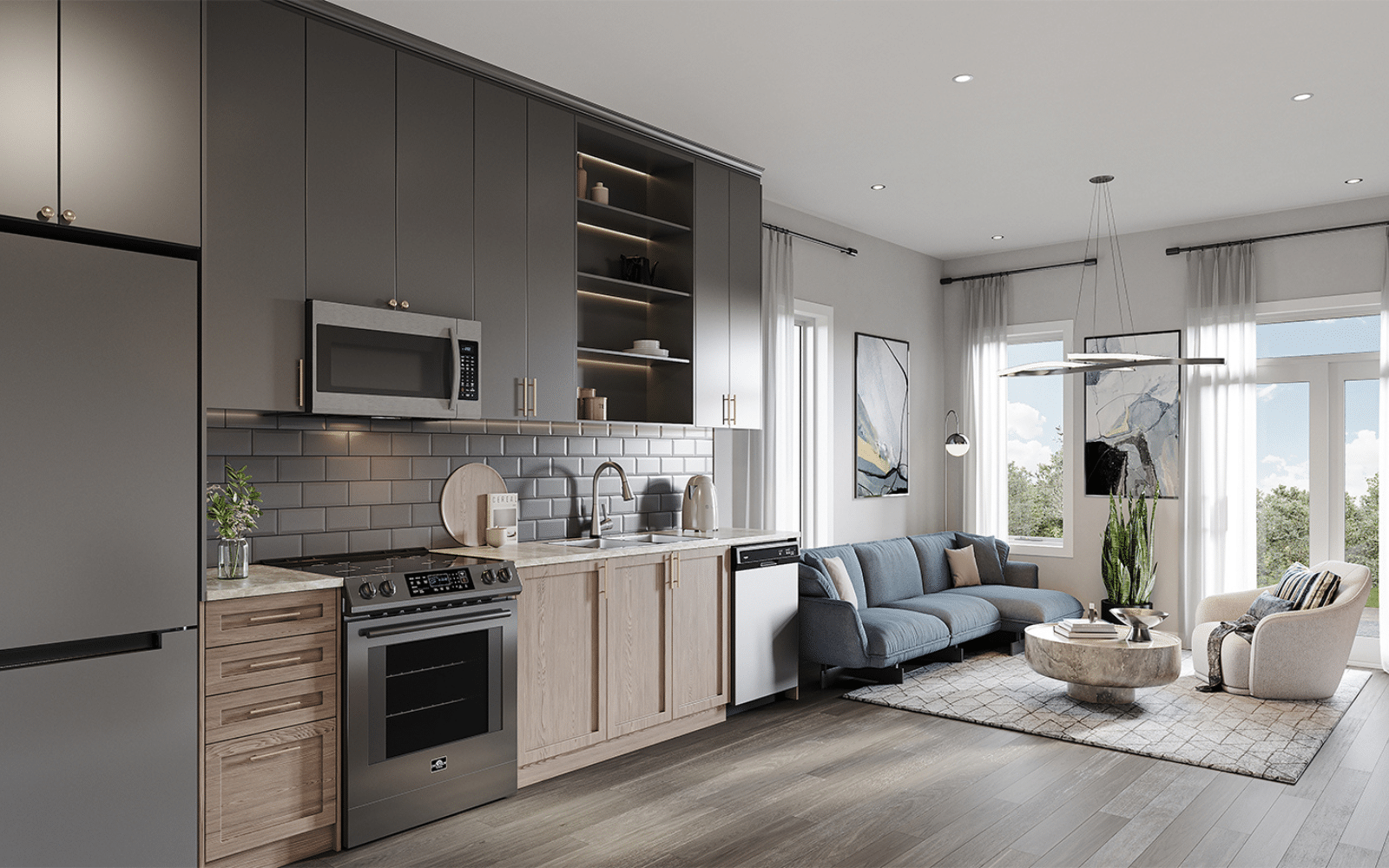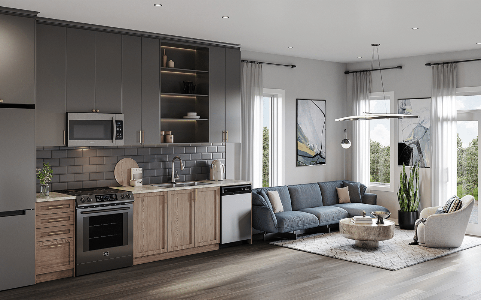 Refrigerator, stove, dishwasher, and in-unit washer and dryer.